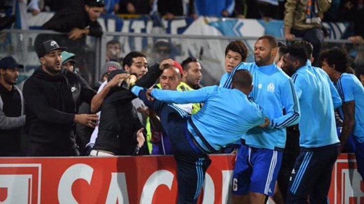 Marsilyalı futbolcu Patrice Evra, maç öncesi rakip taraftara tekme attığı için kırmızı kart gördü.
