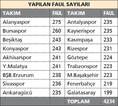 18 takım toplamda 4 bin 234 kez faul yaptı ve bu yüzden 1074 dakika oyun durdu. Mücadeleler sırasında en az faule 199 kez ile Galatasaray başvurdu. Lider Başakşehir 223 faul ile listenin alt sıralarında yer alırken, en fazla faul yapan ekip 275 ile Aytemiz Alanyaspor oldu. Beşiktaş ise 243 kez ile en fazla faul yapan üçüncü takım konumunda. Fiziksel güce çok fazla ihtiyaç duyulan ligimizde, ilk yarıda duran oyunlara harcanan süreler yüzünden neredeyse 12 maç fauller nedeniyle oynanmadı.