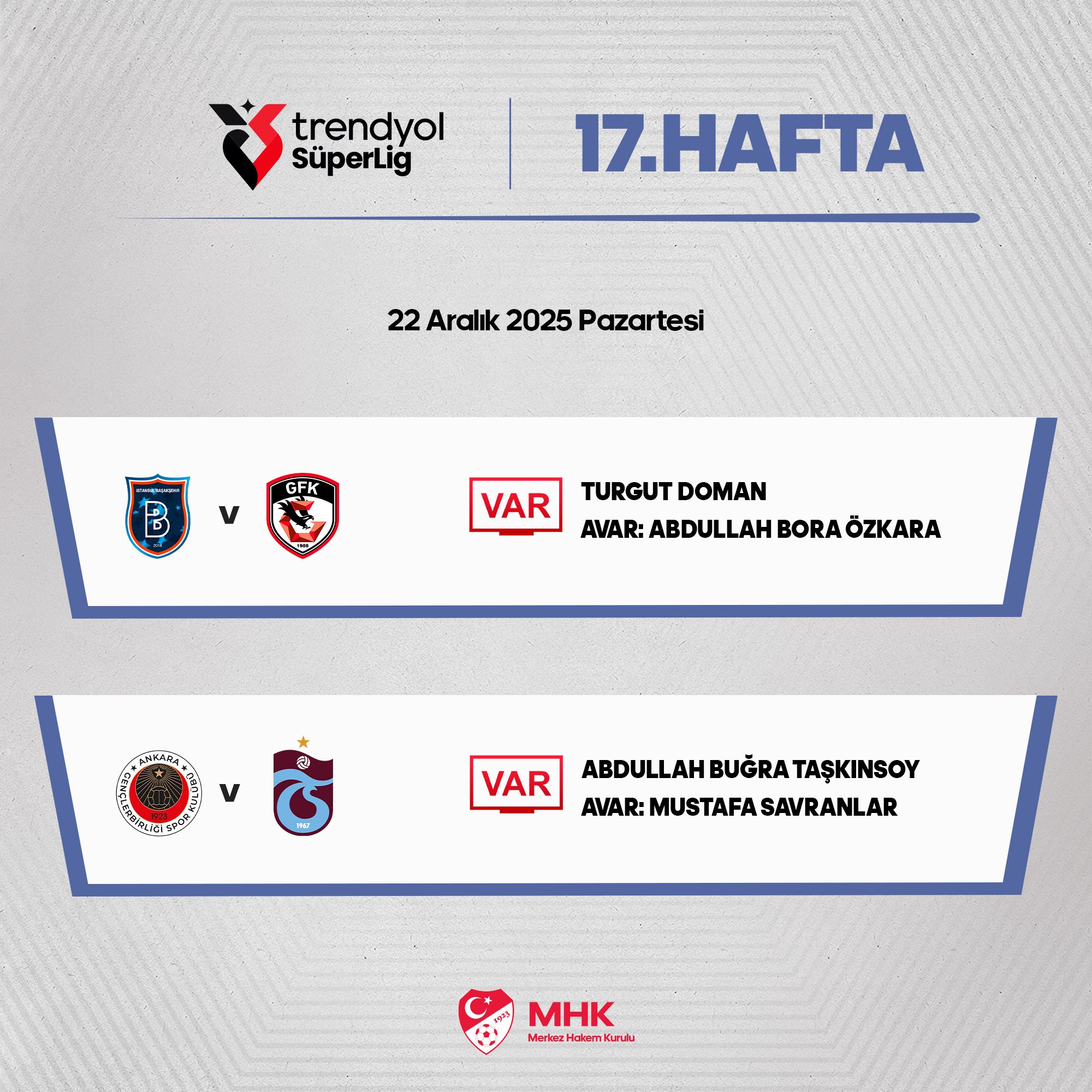 Gençlerbirliği - Trabzonspor maçının VAR hakemi Abdullah Buğra Taşkınsoy oldu. AVAR da ise Mustafa Savranlar görev yapacak.